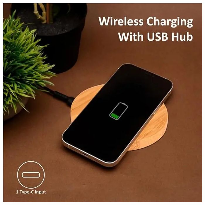 Charge your devices with style and sustainability using this 15W wireless charger—crafted from natural bamboo wood and powered via Type-C for fast, safe, and reliable charging. Perfect for mobile phones and wireless earbuds.