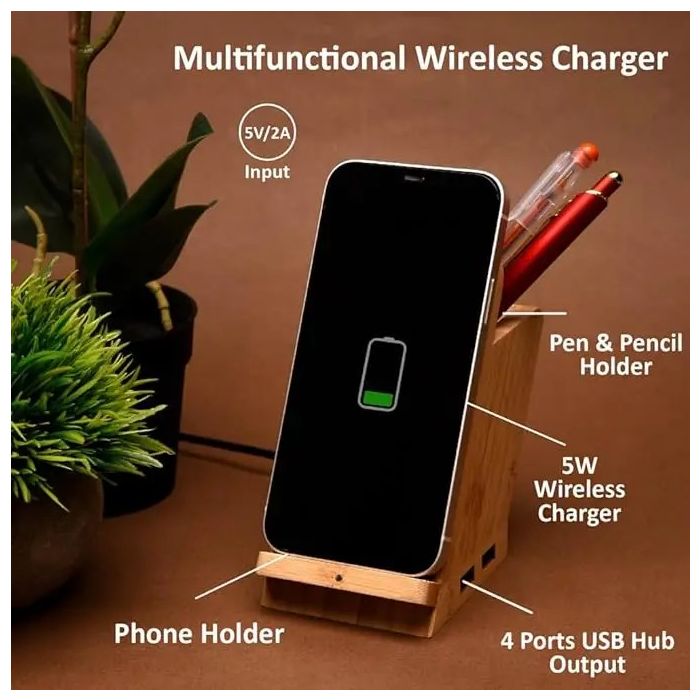 A perfect fusion of nature and technology, this bamboo wireless charger doubles as a pen stand and USB hub—bringing elegance, organization, and efficient charging to your workspace.